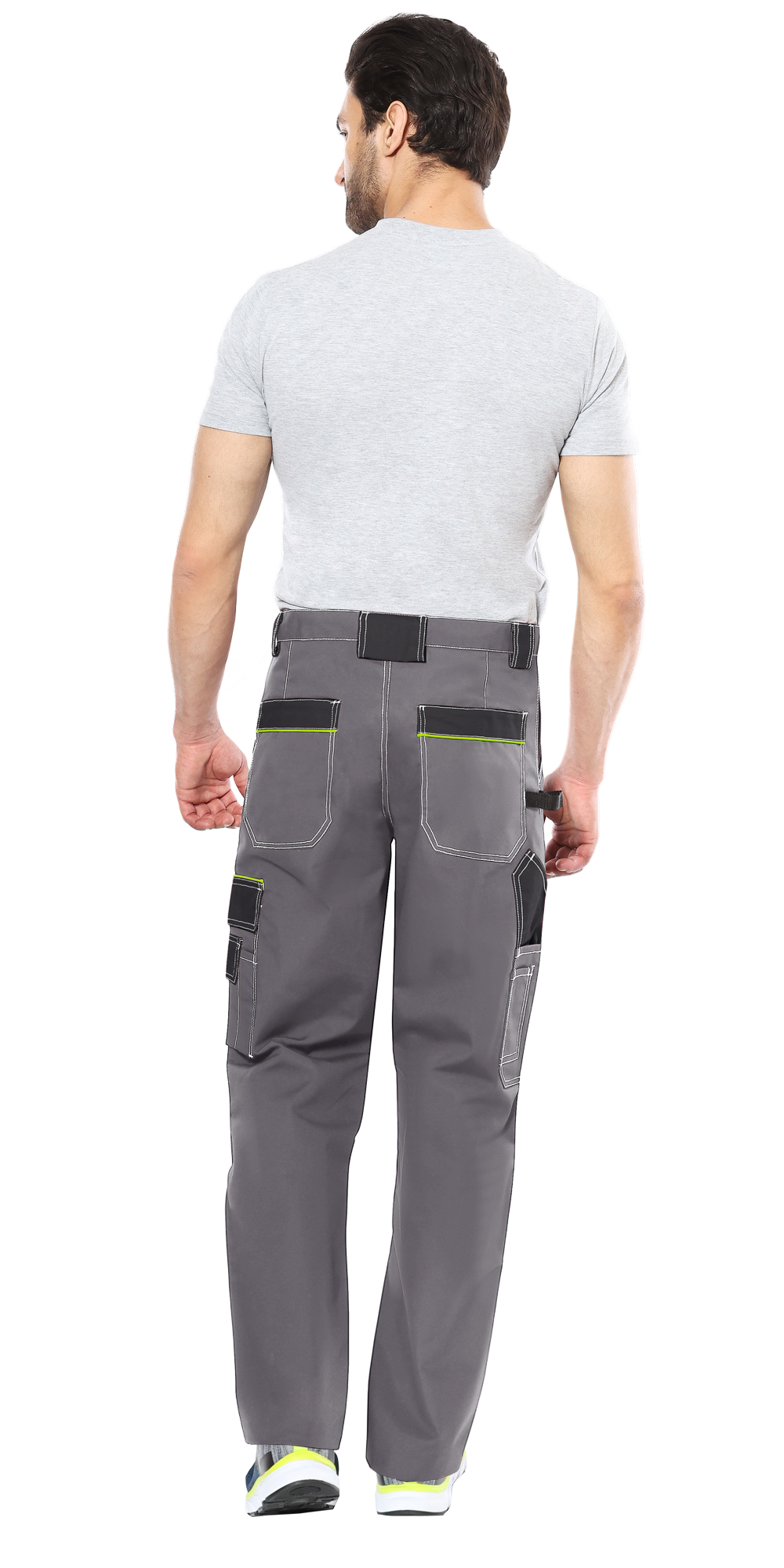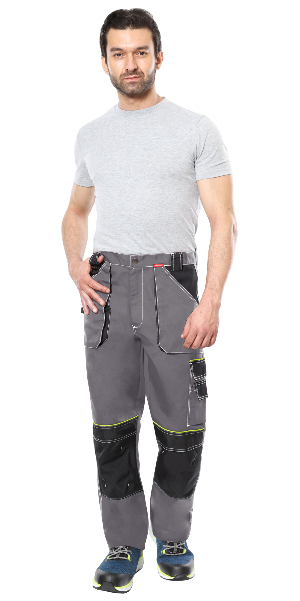 Брюки прямые с застёжкой спереди на гульфик с молнией, с отрезным поясом, с накладными карманами спереди, сзади и на боковых швах, с объёмными наколенниками из плотной, непромокаемой ткани с верхним входом для амортизационного вкладыша.