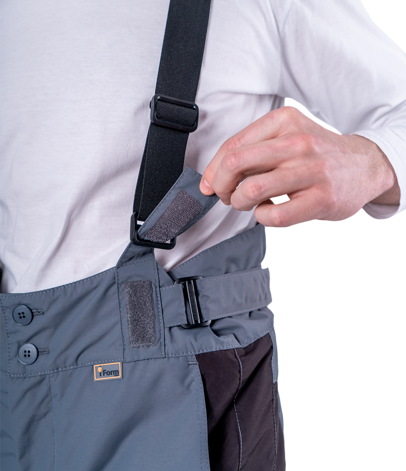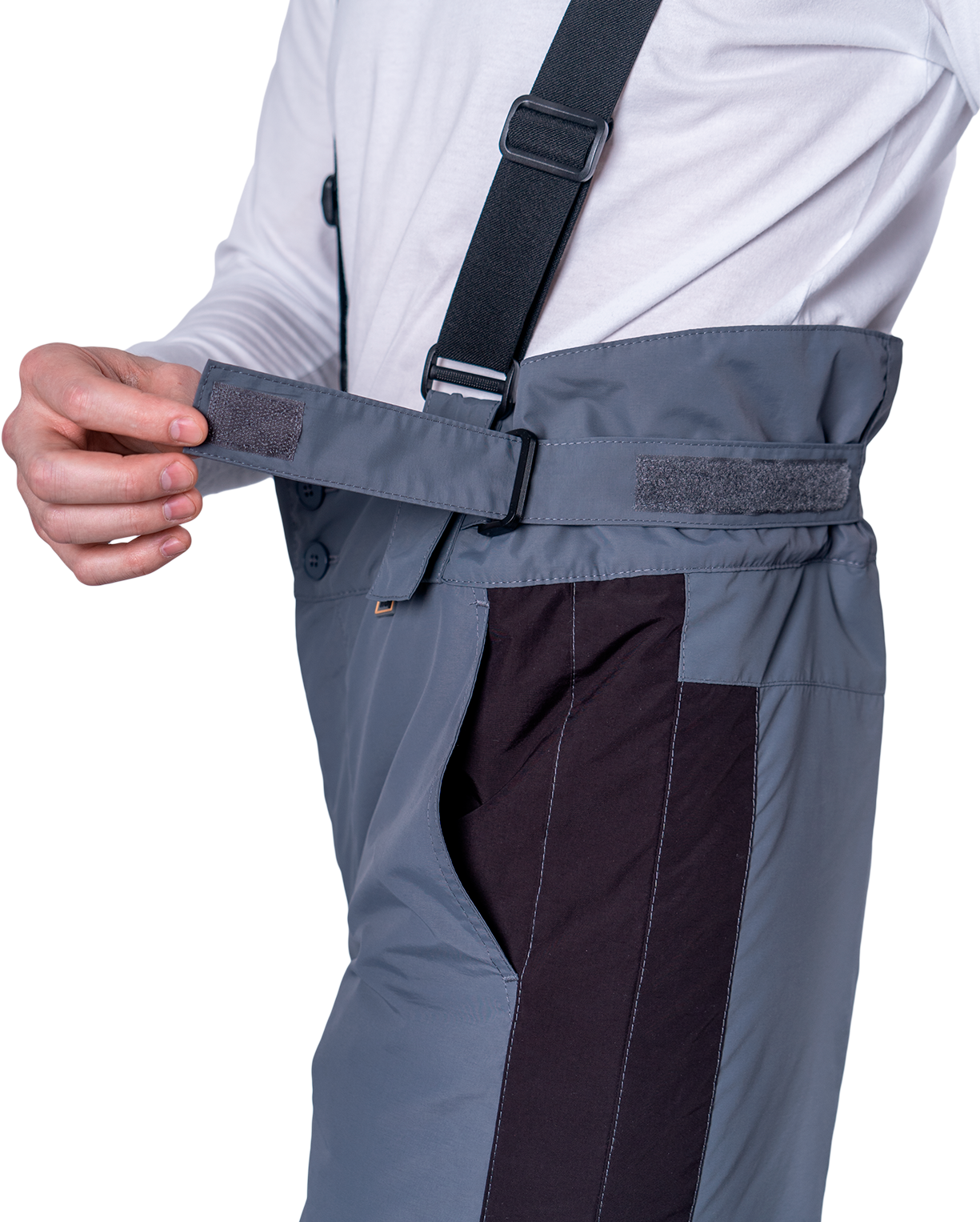 • высокий утеплённый пояс с застёжкой на две пуговицы. Объем пояса регулируется в области боковых швов с помощью хлястиков с застежкой текстильной и держателя с двухщелевой пряжкой