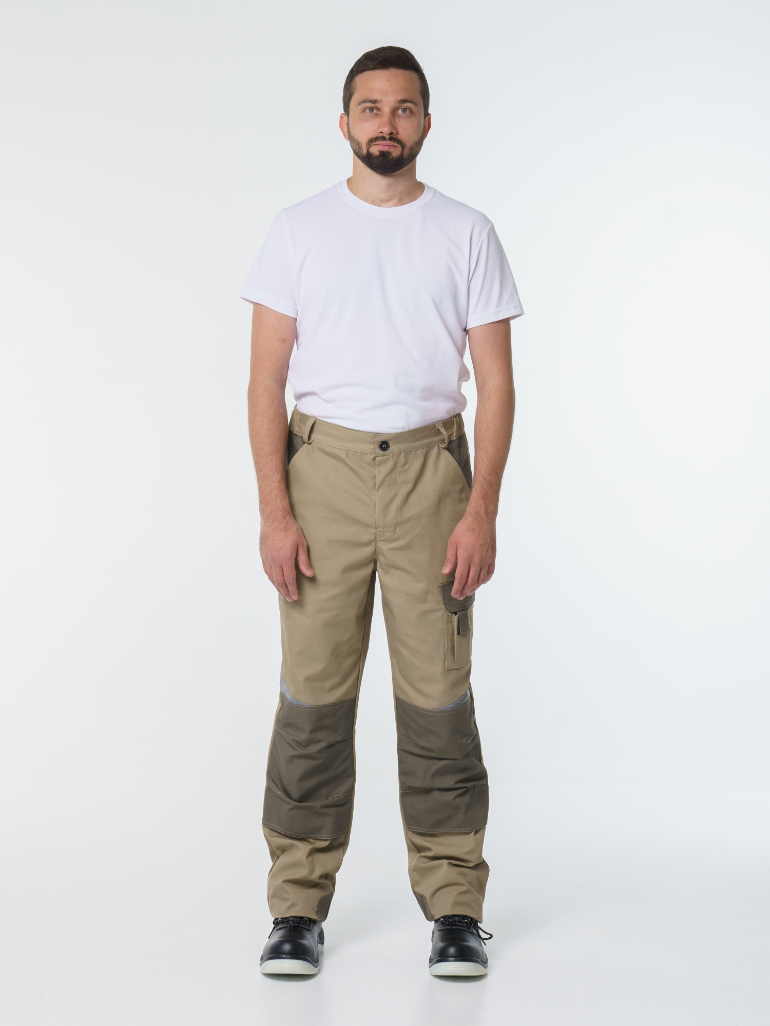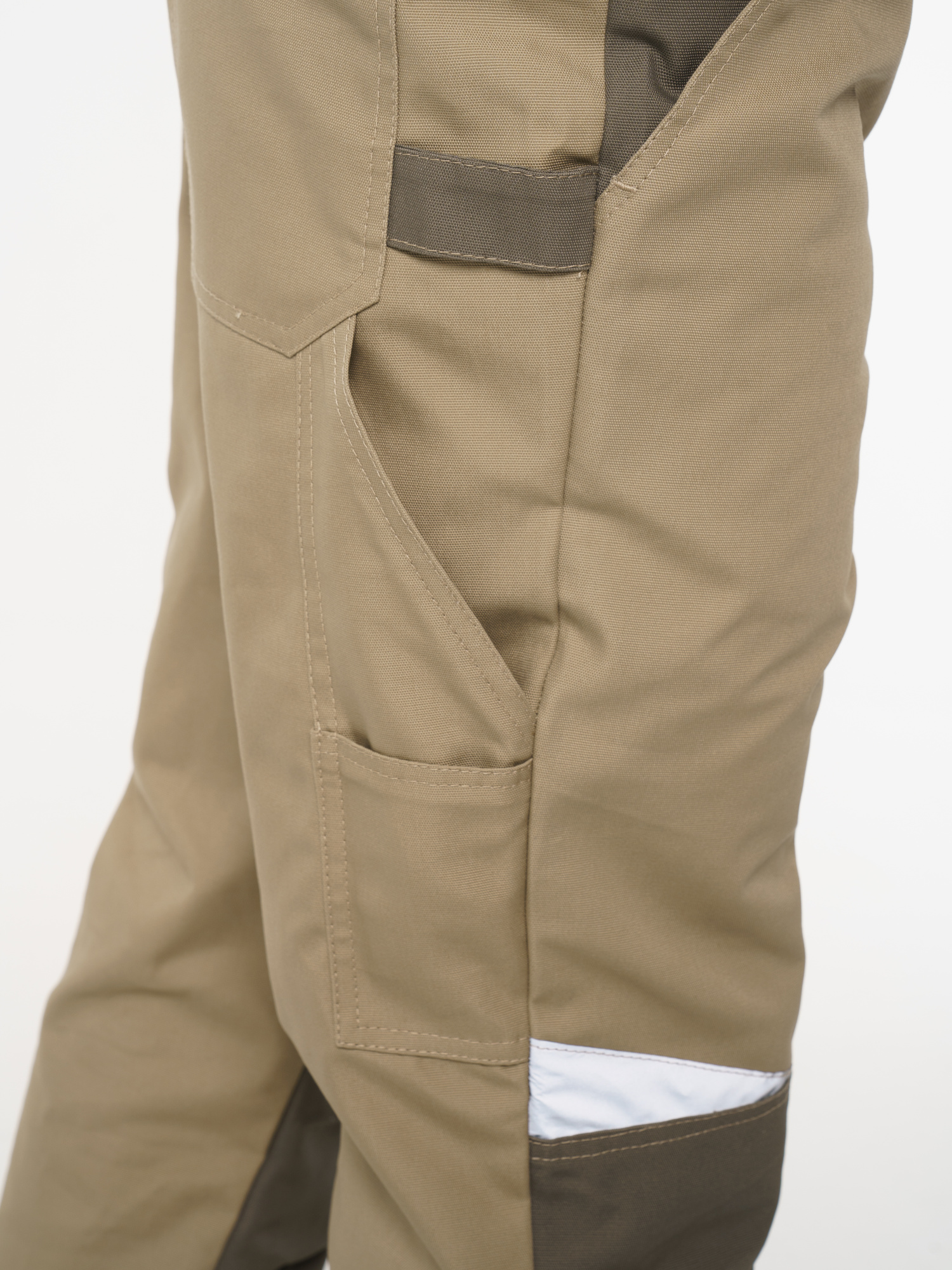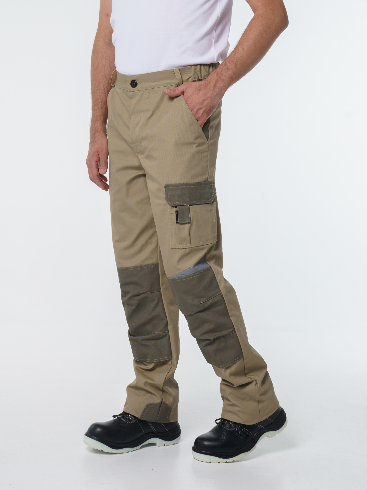 Брюки ФАВОРИТ-МЕГА прямые; с застёжкой гульфика на тесьму - «молния»; с застежкой пояса на одну петлю и пуговицу; с боковыми внутренними карманами; с карманами и фигурными клапанами застегивающиеся на потайную липучку на боковом шве; с фигурным карманом на задней половинке; с карманами под инструменты; с наколенниками. Пояс брюк частично стянут резинкой ткацкой по бокам. В брюках предусмотрена лента светоотражающая (мелкодисперсная белая) 50 мм фигурной формы.