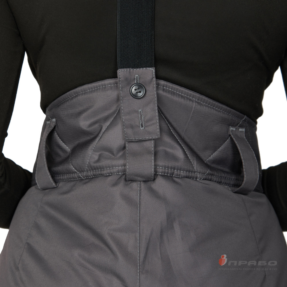 Брюки: прямого кроя, с центральной застежкой на гульфик и молнию, с притачным утеплённым поясом. Пояс застёгивается спереди на две пуговицы. Завышенный пояс на спинке обеспечивает защиту поясницы от продувания и сохранение тепла в пододёжном пространстве. Большое количество шлевок фиксируют ремень и обеспечивают плотное прилегание к поясу. Съёмные комбинированные бретели из ткани и эластичной тесьмы.