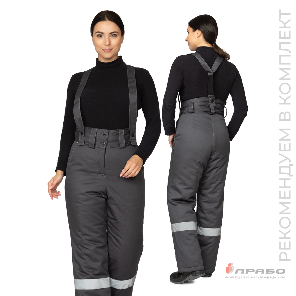 Брюки: прямые, с притачной утеплённой подкладкой, с центральной застёжкой гульфик на молнию. Притачной утеплённый пояс, более широкий на спинке, застёгивается на 2 пуговицы. На поясе пять шлёвок. Бретели пристёгиваются к поясу на пуговицы, со стороны спинки бретели выполнены частично с открытой эластичной лентой. Задние половинки с вытачками на талии обеспечивают силуэтную посадку.