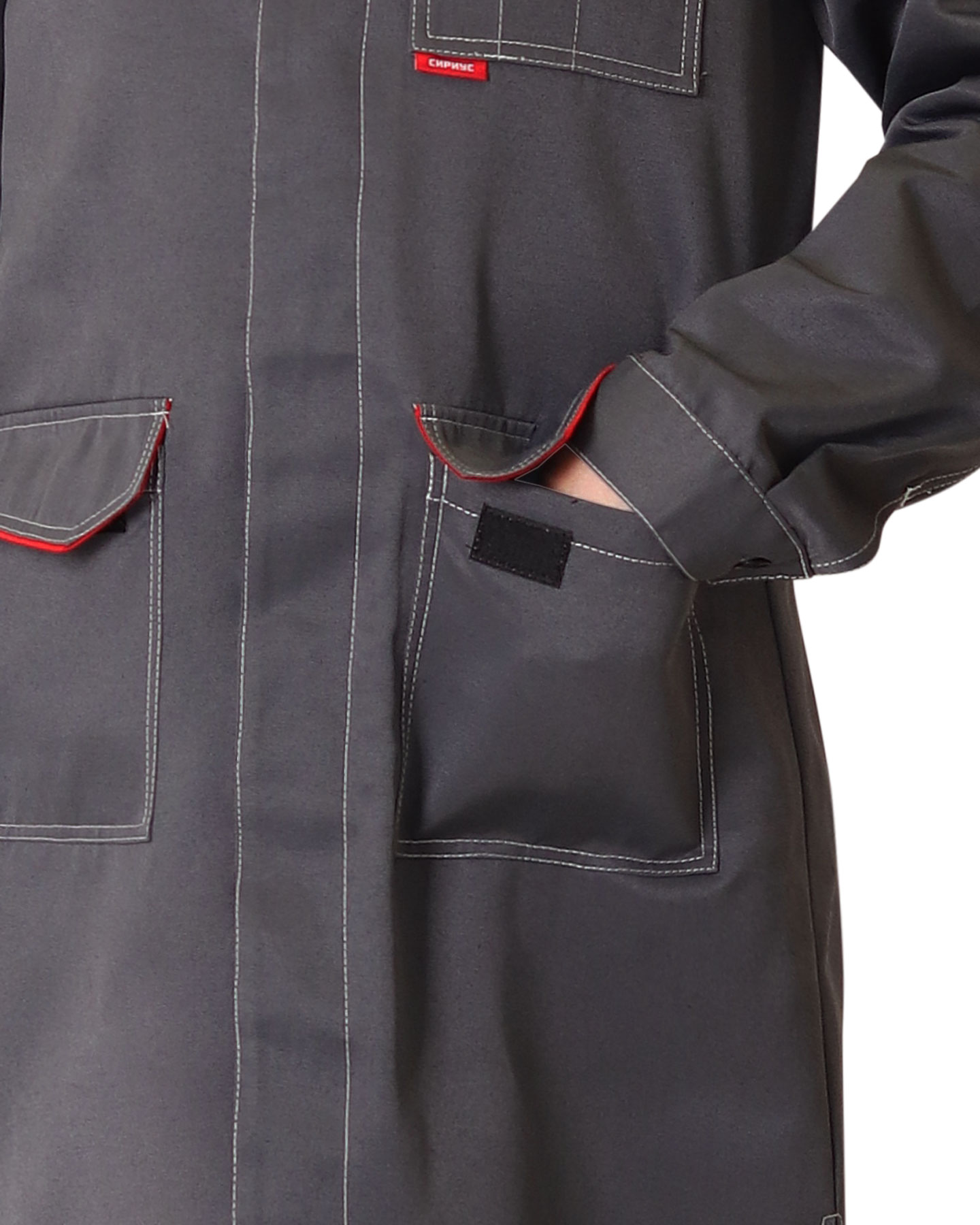 В халате предусмотрен кант СВМ д.3мм светоотражающий 100К для обеспечения сигнальной видимости в условиях пониженной видимости.