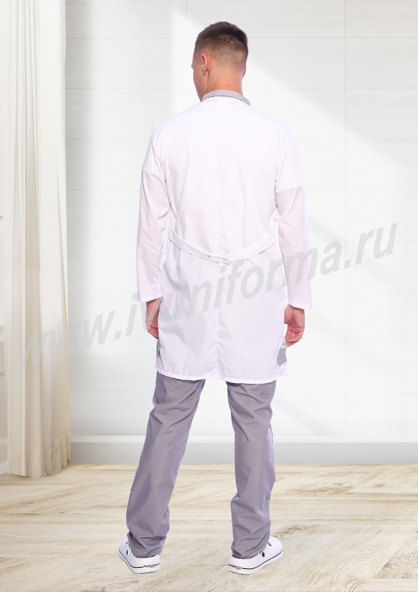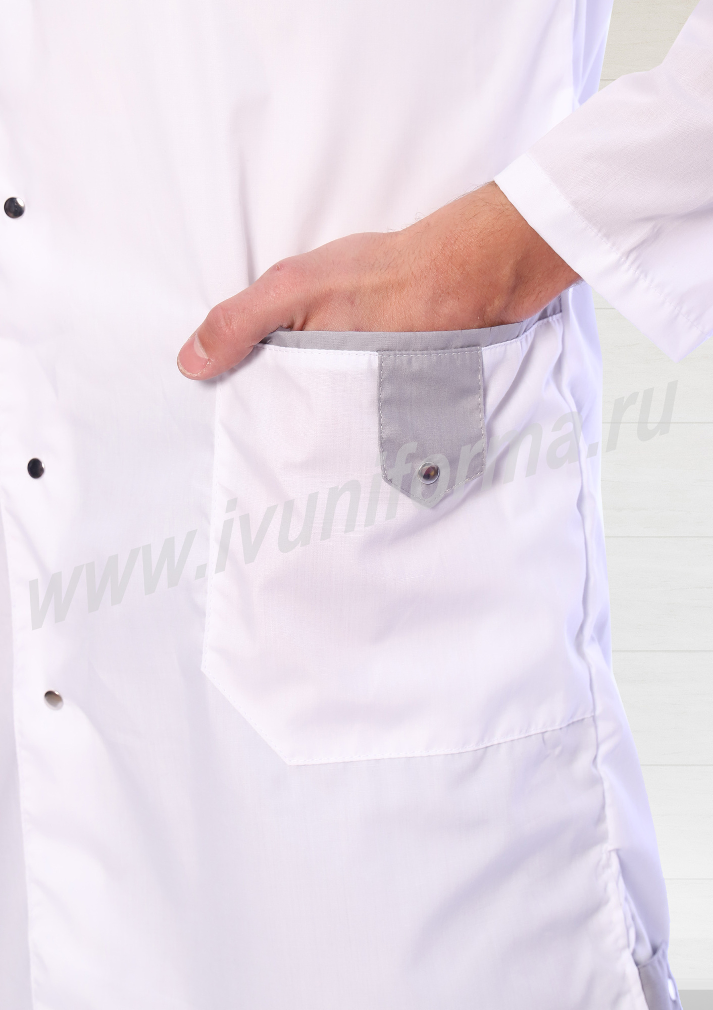 Халат мужской прямого силуэта с центральной бортовой застежкой на кнопки. Полочки с отрезными кокетками, вместительными накладными карманами фигурной формы в нижней части и нагрудным карманом на левой полочке. Спинка с отрезной кокеткой и средним швом. Объем по линии талии регулируется полупоясами с фиксацией на кнопки. Воротник стойка выполнен из контрастного материала. Рукав втачной длинный. Карманы с отделкой из контрастного материала и декоративными хлястиками. В боковых швах халата выполнены разрезы, обеспечивающие свободу движений, разрезы декорированы хлястиками из отделочного материала. Халат прост в уходе, практичен и удобен. Халат медицинский предназначен для медицинских сотрудников.