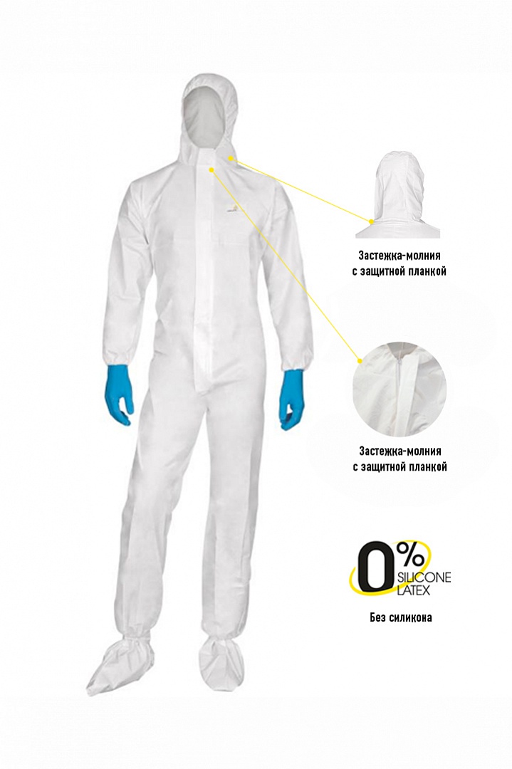 Комбинезон с капюшоном Delta Plus DT115 белый, размер ХL DT115XG защищает от воздействия химических веществ. При изготовлении используется легкий нетканый микропористый ламинированный материал. Для большего комфорта на капюшоне, на талии, манжетах рукавов и лодыжках предусмотрена эластичная резинка.