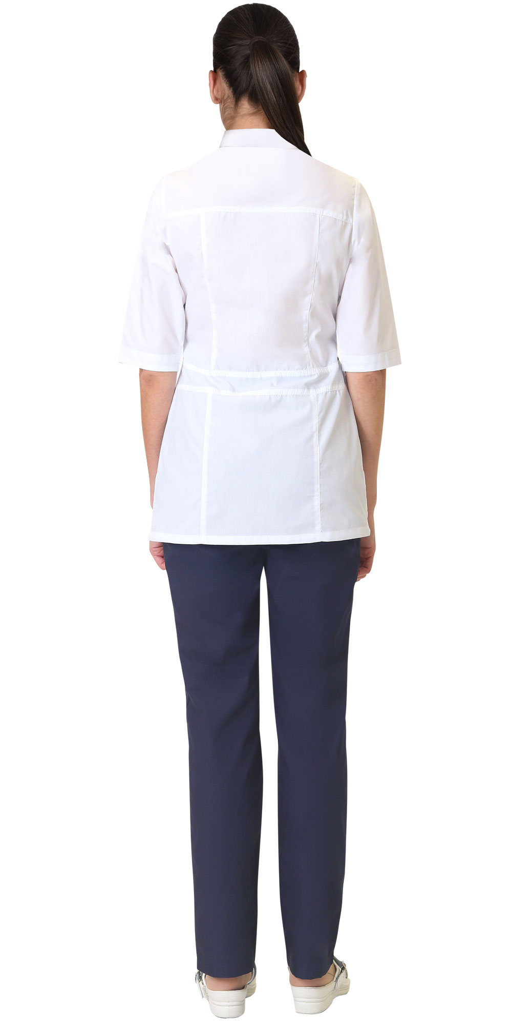 Блуза полуприлегающего силуэта с центральной застёжкой на молнию от горловины. Воротник стойка. С двумя внутренними карманами в рельефе. Рукава втачные, длиной 3/4. Брюки прямые на притачном поясе, частично стянутом на эластичную тесьму, спереди на поясе вставка.