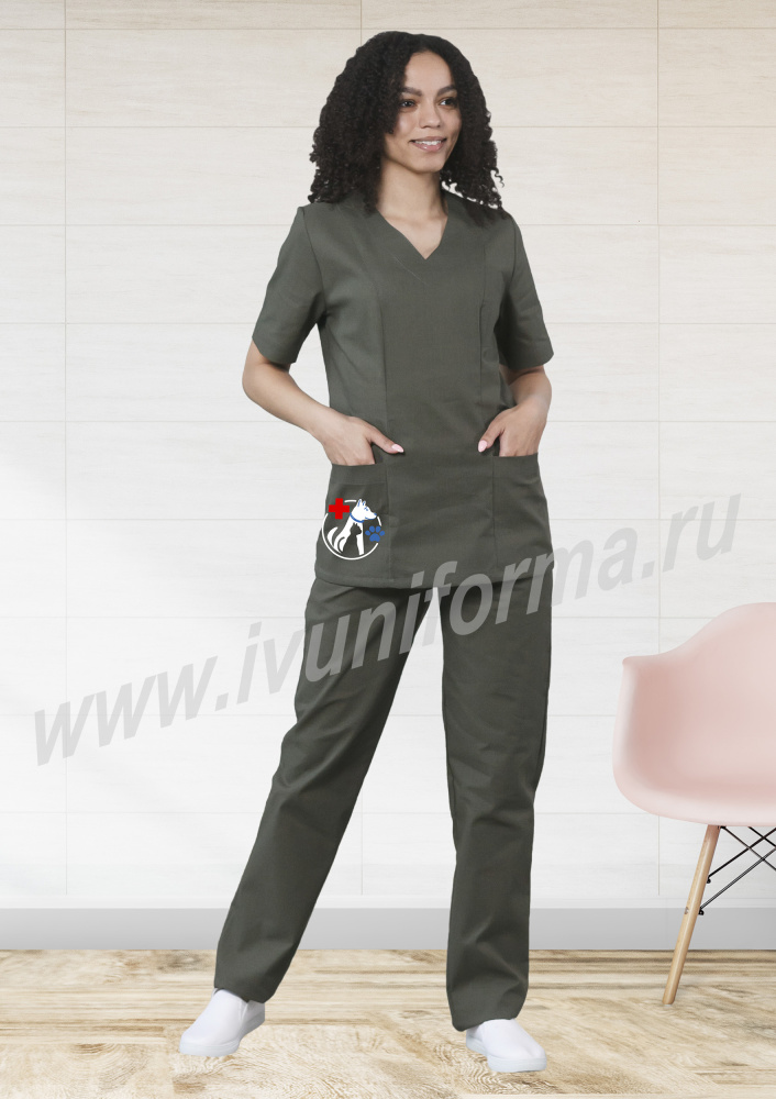 Костюм ветеринара состоит из куртки и брюк, выполнен из бязи ГОСТ, содержащей 100% хлопковые волокна, что позволяет избежать статического притяжения при контакте с шерстью животных. Куртка прямого силуэта с V-образным вырезом горловины, обработанной  планками. На передней полочке расположены один нагрудный, и два нижних накладных кармана, на одном из которых нанесен рисунок с изображением домашних питомцев. Нанесение изображения выполнено методом термотрансферной технологии. Горловина спинки обработана обтачкой. Рукав короткий, втачной. Брюки прямые, свободного облегания, с поясом на резинке. Для сборки костюма используются нитки в цвет ткани. Костюм предназначен для людей, помогающих  домашним любимцам, а также предназначен для защиты от общих производственных загрязнений и имеет класс защиты "З".