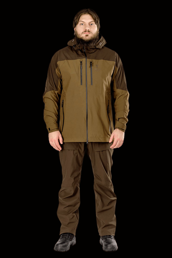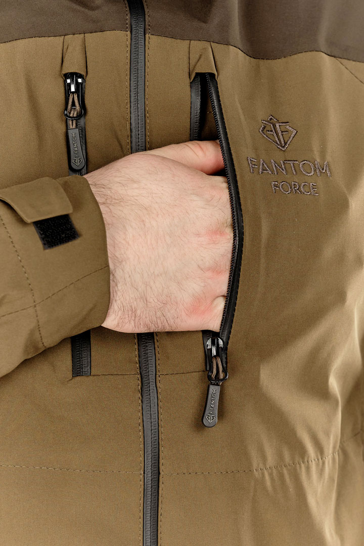 Костюм состоит из куртки и брюк, выполненных из высококачественной тканиAlyaska (NEW) (40% хлопок,50% ПЭ,10% нейлон) с мембраной F-PROTEX CLIMATE 10000\10000, которая обеспечивает защиту от ветра и влаги. Куртка имеет отстегивающийся капюшон и 15 функциональных карманов для различных нужд. Брюки имеют удлиненную отстегивающуюся спинку, брючные помочи на полуавтоматическх фастексах и противоскользящие манжеты по низу. Костюм также оснащен противоскользящей стропой на плечах с кожанным стопером, сигнальной складной лентой на рукаве, влагозащитными молниями и магнитной фурнитурой. Костюм поставляется в фирменной сумке Fantom Force.