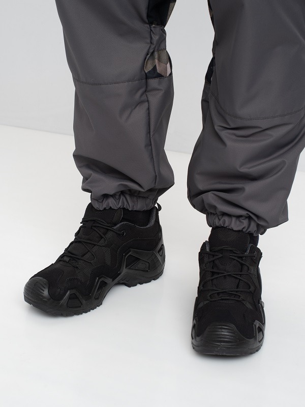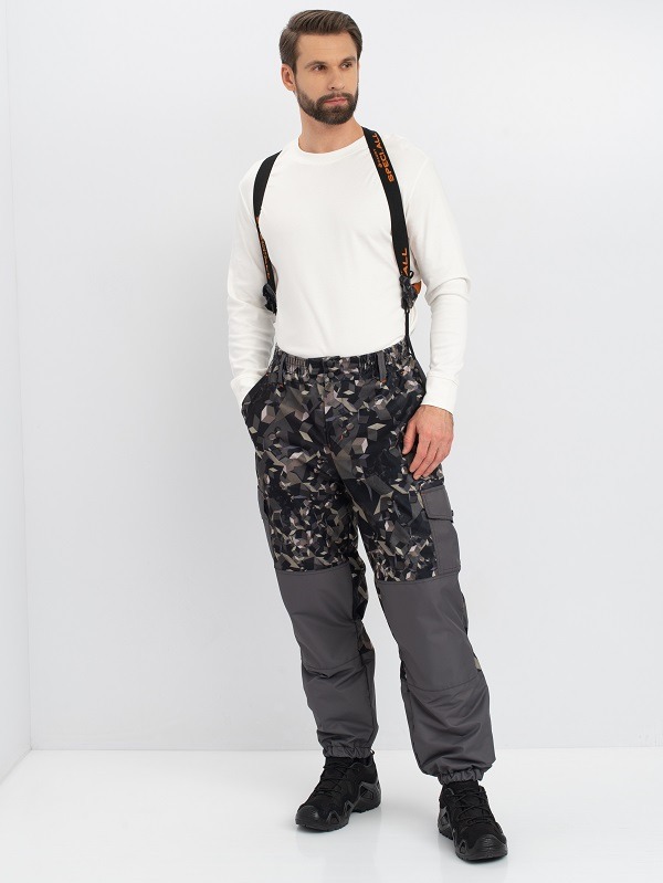 Внизу с двумя косыми прорезными карманами на клапане, объемные карманы на рукавах. Брюки анатомического кроя с подкладкой из флиса, низ на резинке, застежка гульфик на кнопках, пояс на широкой прошитой резинке, на поясе шлёвки для ремня. К поясу крепятся съёмные подтяжки-кобура на пуговицах, спереди два боковых прорезных кармана, сзади два накладных кармана на липучках, на уровне колена два боковых накладных кармана на кнопках, по низу брюк на резинке.