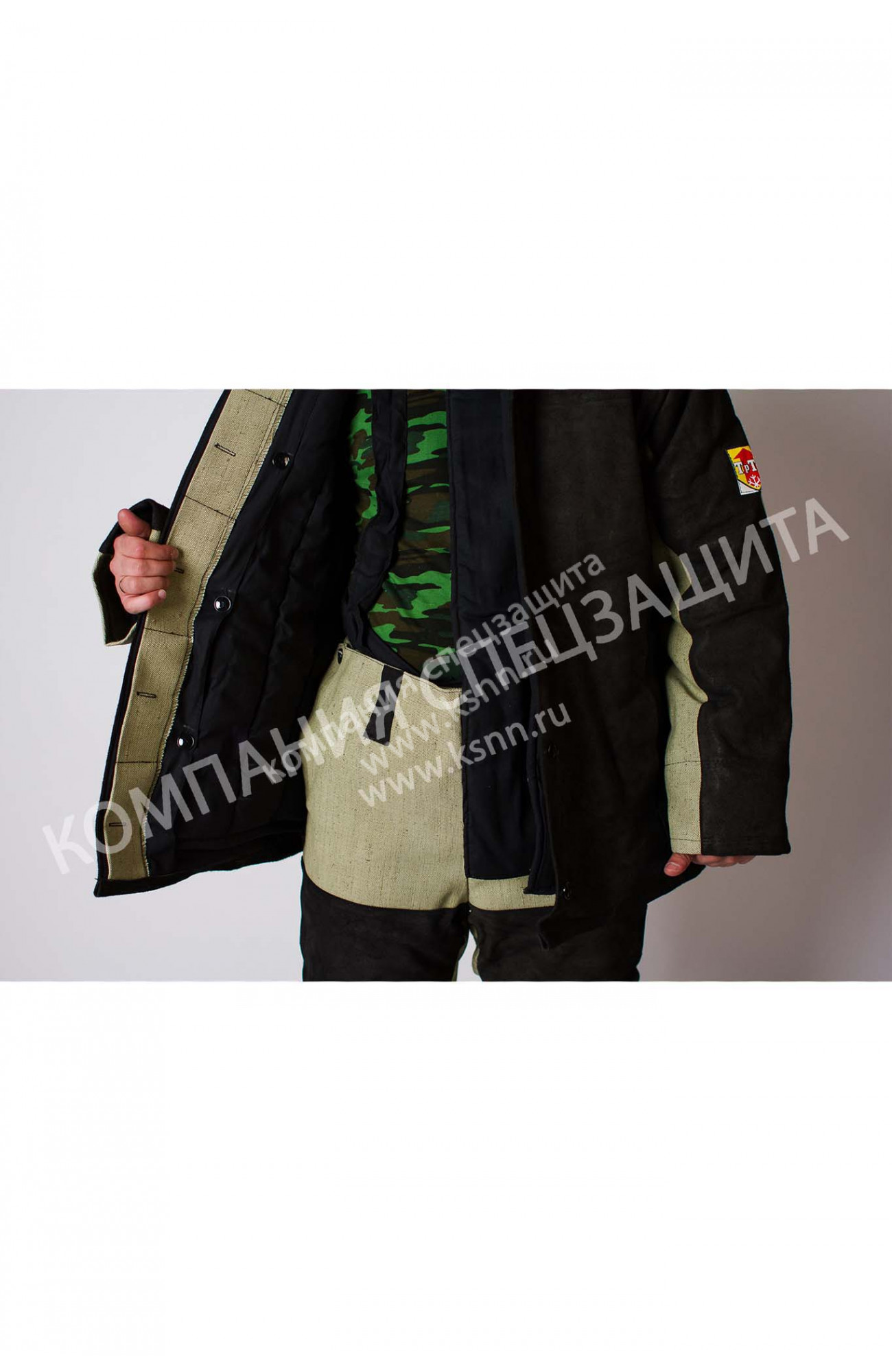 -Спинка с отрезной кокеткой. Кокетка из кожевенного спилка, дублируется подкладкой. По шву настрачивания кокетки расположены вентиляционные отверстия. Рукава втачные, состоящие из трех деталей: передней, локтевой и верхней; внутренними напульсниками с эластичной лентой из огнестойкого материала. На левом рукаве настрочен логотип ТрТн. Верхняя часть рукава из кожевенного спилка дублируется подкладкой. В верхней части боковых швов, расположены вентиляционные отверстия.