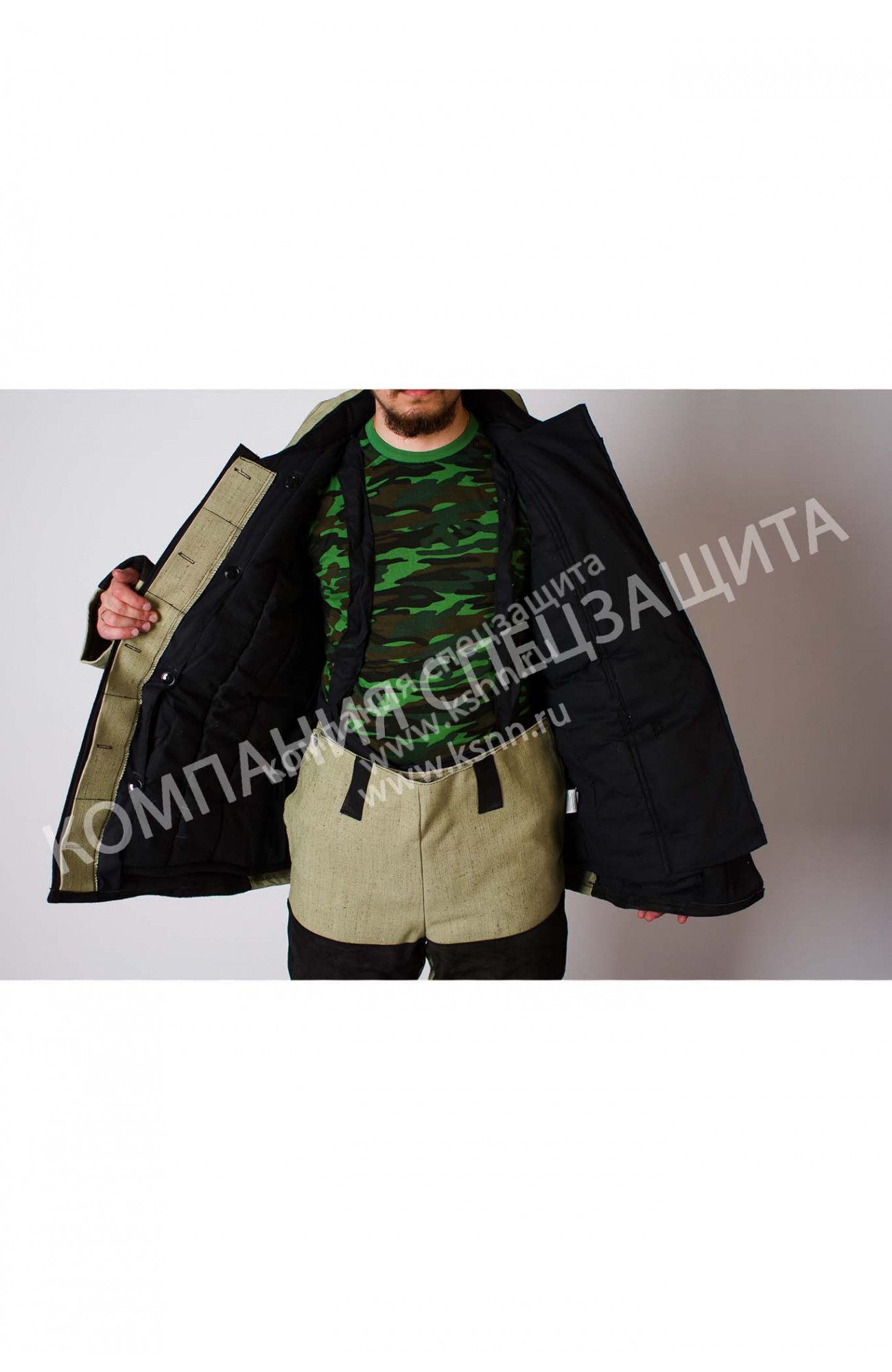 -Костюм комбинированный из спилка и парусины полульняной, состоит из куртки, брюк и пристегивающейся утепленной подкладки.