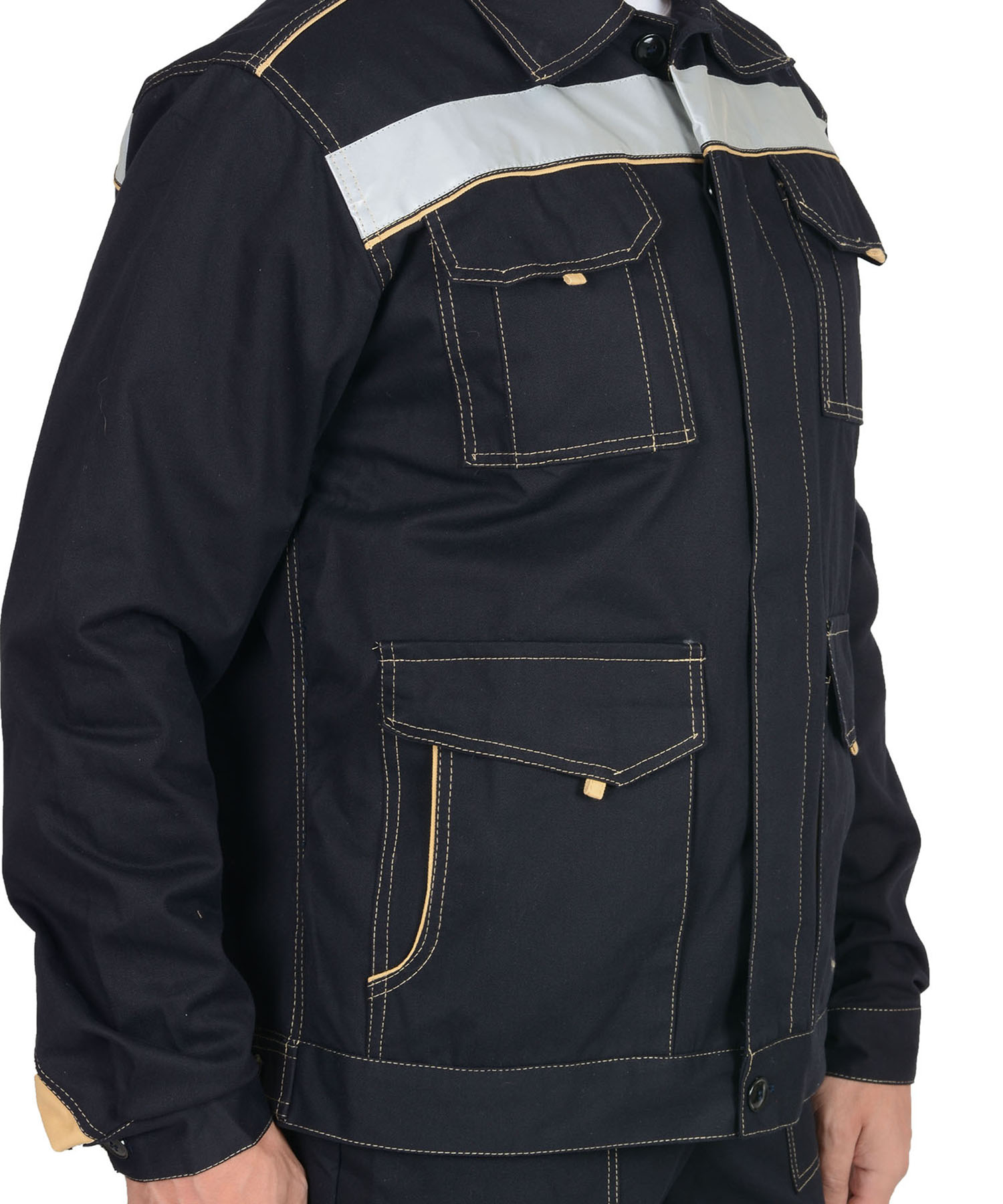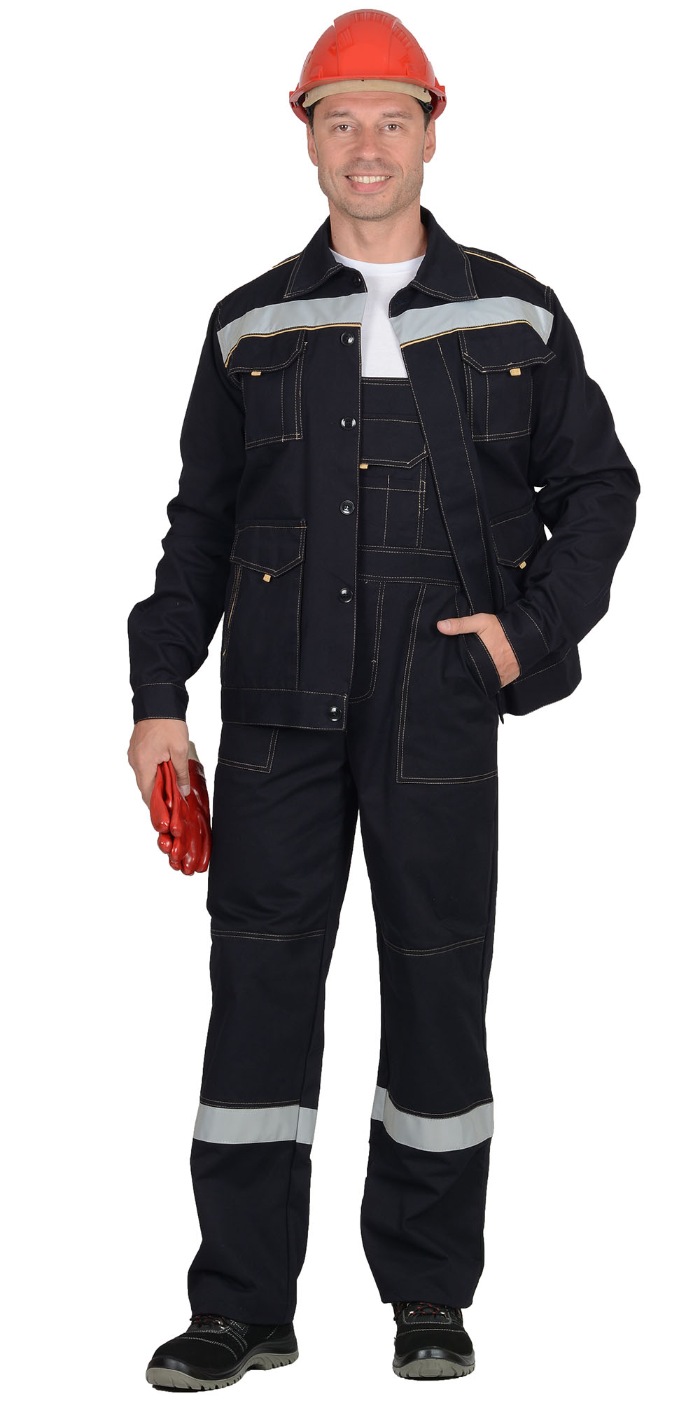 Куртка укороченная, с отложным воротником,с центральной потайной застежкой на пуговицы, пояс регулируется по ширине патами и пуговицами. Полукомбинезон прямого покроя, с центральной заст.жкой спереди, с усилительными накладками в области колен. Костюм с контрастными строчками и СОП шириной 50 мм. ГОСТ 12.4.280-2014.,