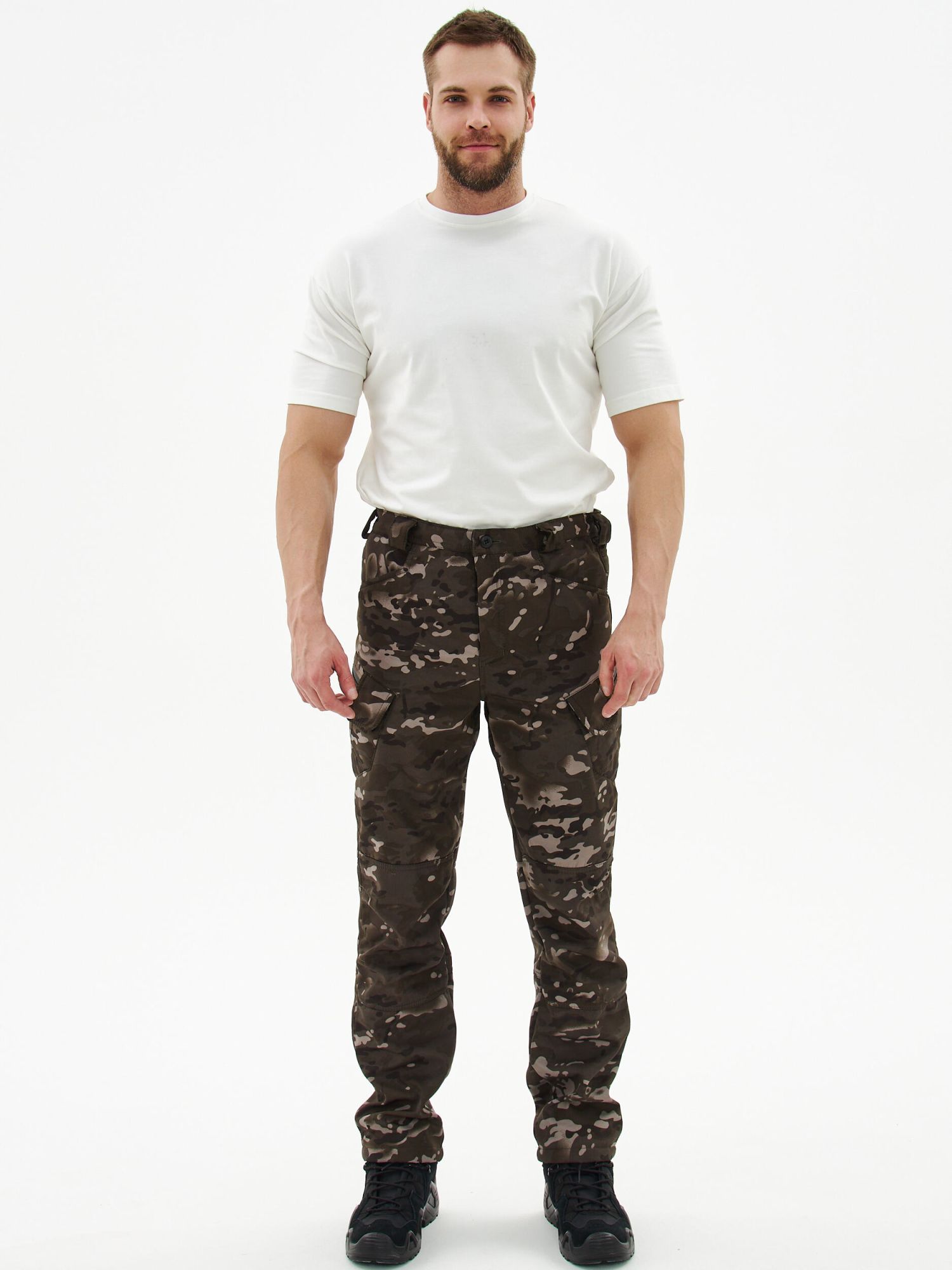 - на боковых сторонах брюк объемные карманы с двумя складками со входом на молнию и ограничителями с двух сторон, замок молнии закрывает декоративный клапан на липучке;