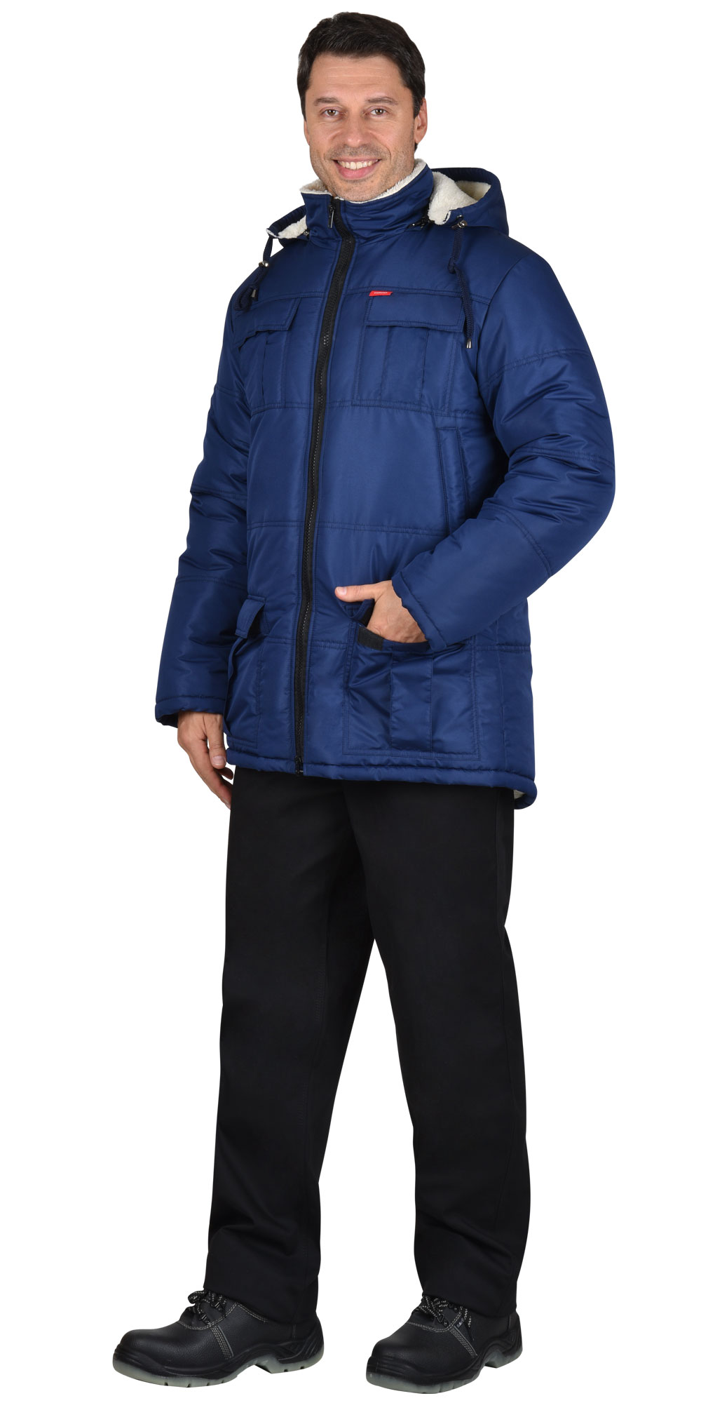 Куртка мужская, длинная, стеганая; с притачной утеплённой подкладкой; с фигурной линией низа спинки; с центральной застёжкой на двухзамковую тесьму - «молния» до верха; с внутренней подпланкой простёганной 5-ю отделочными строчками; с воротником-стойка; с утепленным пристегивающимся капюшоном на тесьму - «молния»; нагрудными накладными карманами с клапанами застегивающиеся на потайную ленту «контакт» и складками для объема; в средней части полочки прорезные карманы в «листочку» застегивающиеся на потайную кнопку д.15мм 1шт; с нижними накладными карманами с клапанами застегивающимся на потайную ленту «контакт» и складками для объема; с внутренним накладным карманом на подкладке на тесьму – «молния». Рукава втачные, двухшовные. Ткань верха: «Таслан» ВО и ПУ МИЛКИ пропиткой, состав: 100% п/э; Ткань подкладочная: МЕХ искусственный «Sherpa YR» состав: 100% п/э, Утеплитель - «Синтепон» 150г/м2 – 2 слоя. ГОСТ 25295-2003