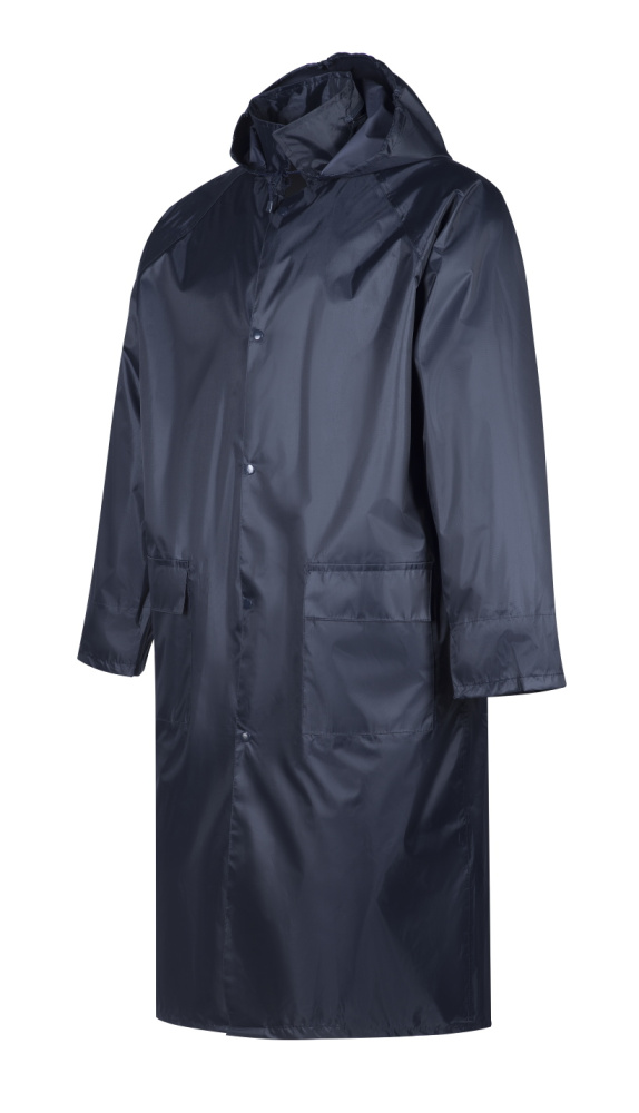 Влагозащитный плащ для защиты от атмосферных воздействий: дождя, ветра, пыли. Плащ с капюшоном (прячется в воротник на молнии), вентиляционными отверстиями под рукавами и по спинке (с сеткой), двумя карманами под клапанами, застежка на двойной ряд кнопок + двойная планка, муфты в рукавах, поставляется в индивидуальной многоразовой упаковке. Используемая конструкция застежки является наиболее надежной для плаща, так как при значительной длине  застежки присутствует риск преждевременной поломки застежки-молнии, а при поломке одной или нескольких кнопок, изделие можно продолжать использовать. Плащ поставляется в индивидуальной многоразовой упаковке. Материал - ПВХ усиленный полиэстером (полиэстеровыми волокнами- нитями) с толщиной листа -0,18 мм, все соединения проклеены ПВХ лентой, цвета темно-синий. Рекомендуется для использования поверх верхней одежды в дождливую погоду во всех отраслях промышленности, на транспорте и сельском хозяйстве  Размеры "европейские", соответствуют стандартам РФ: M, L, XL, 2XL,3XL, 4XL