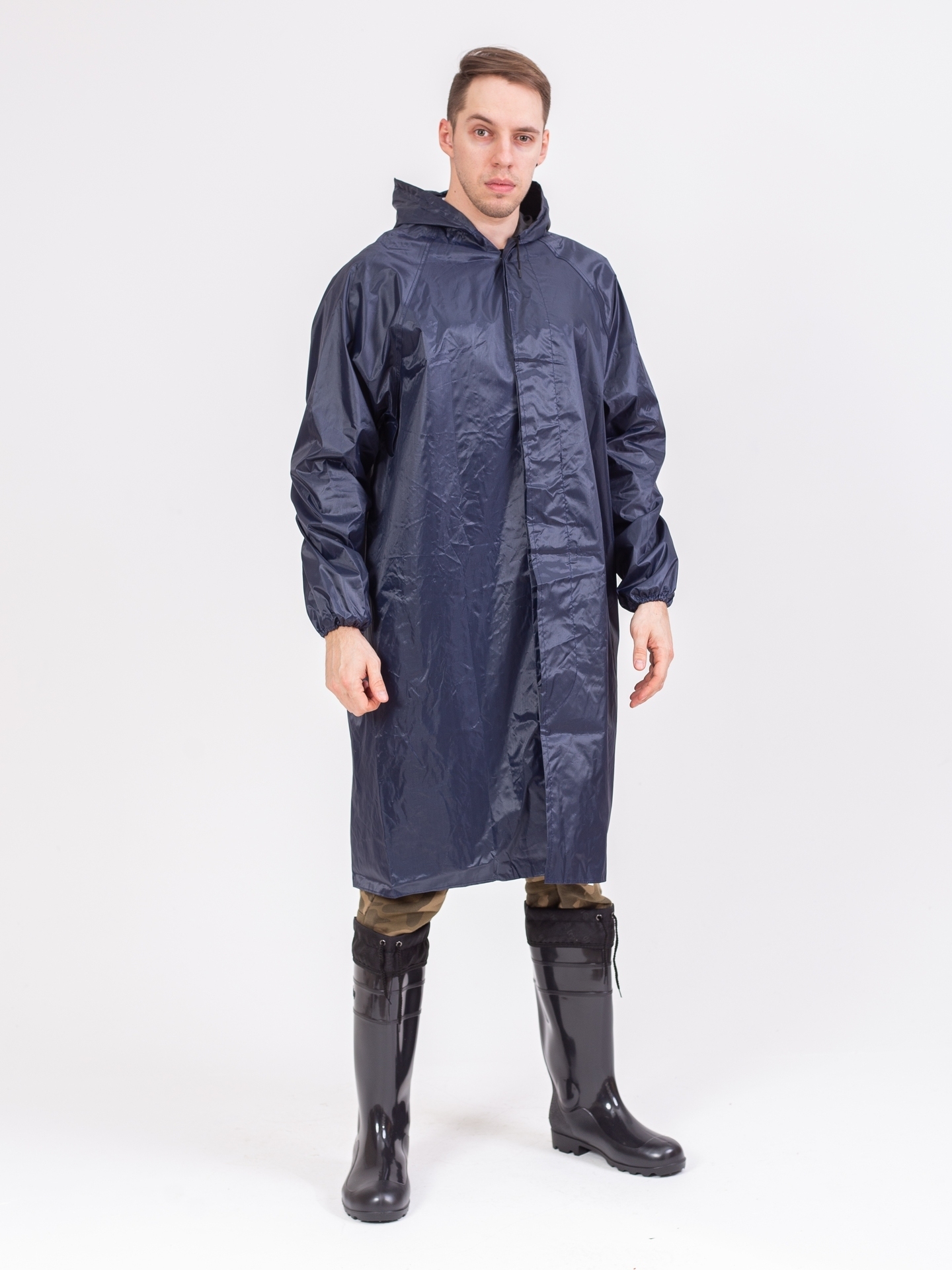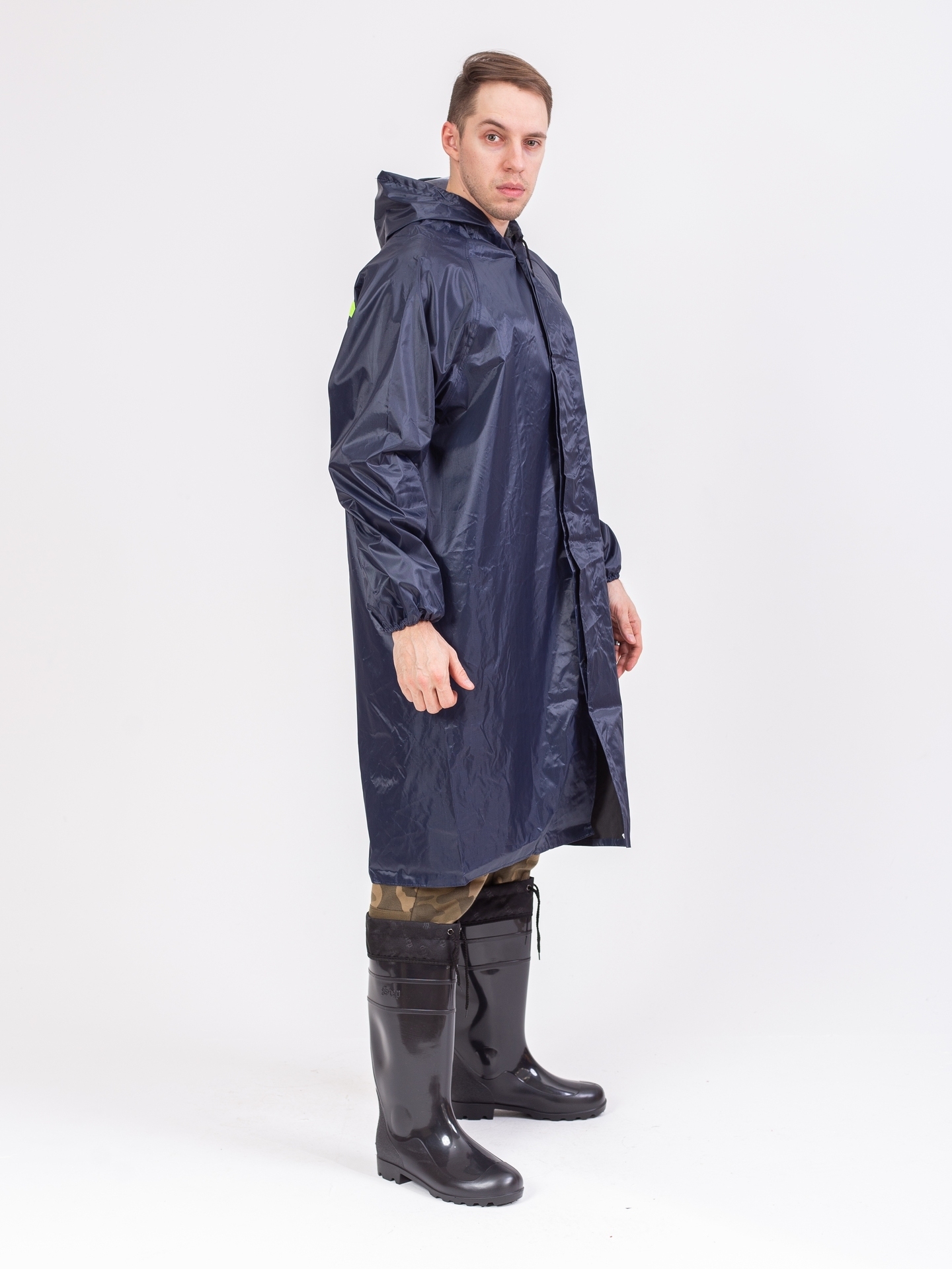Плащ с застежкой на кнопках, отложной воротник, имеет капюшон, прошитые и герметично проклеенные швы, манжеты резинки на рукавах. Объем капюшона регулируется по лицевому вырезу шнуром с наконечниками.
