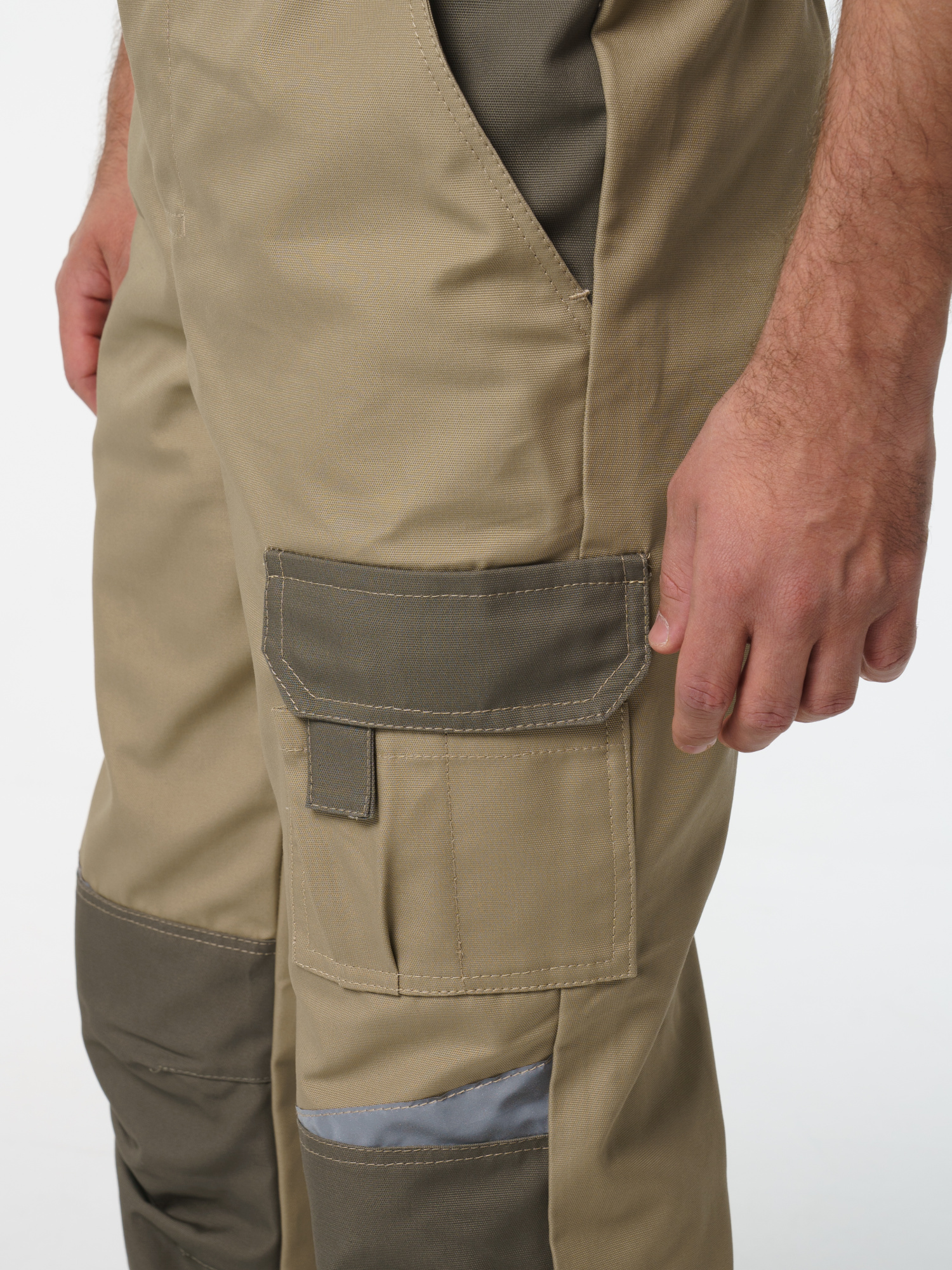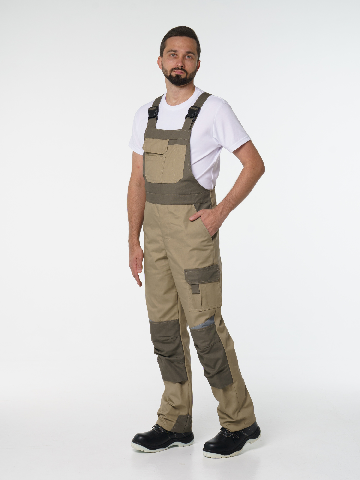 Полукомбинезон с застёжкой гульфика на молнию и застёжкой в боковом шве на пуговицы; с различными многофункциональными карманами; с объемными наколенниками. В полукомбинезоне предусмотрена лента светоотражающая (мелкодисперсная белая) фигурной формы.