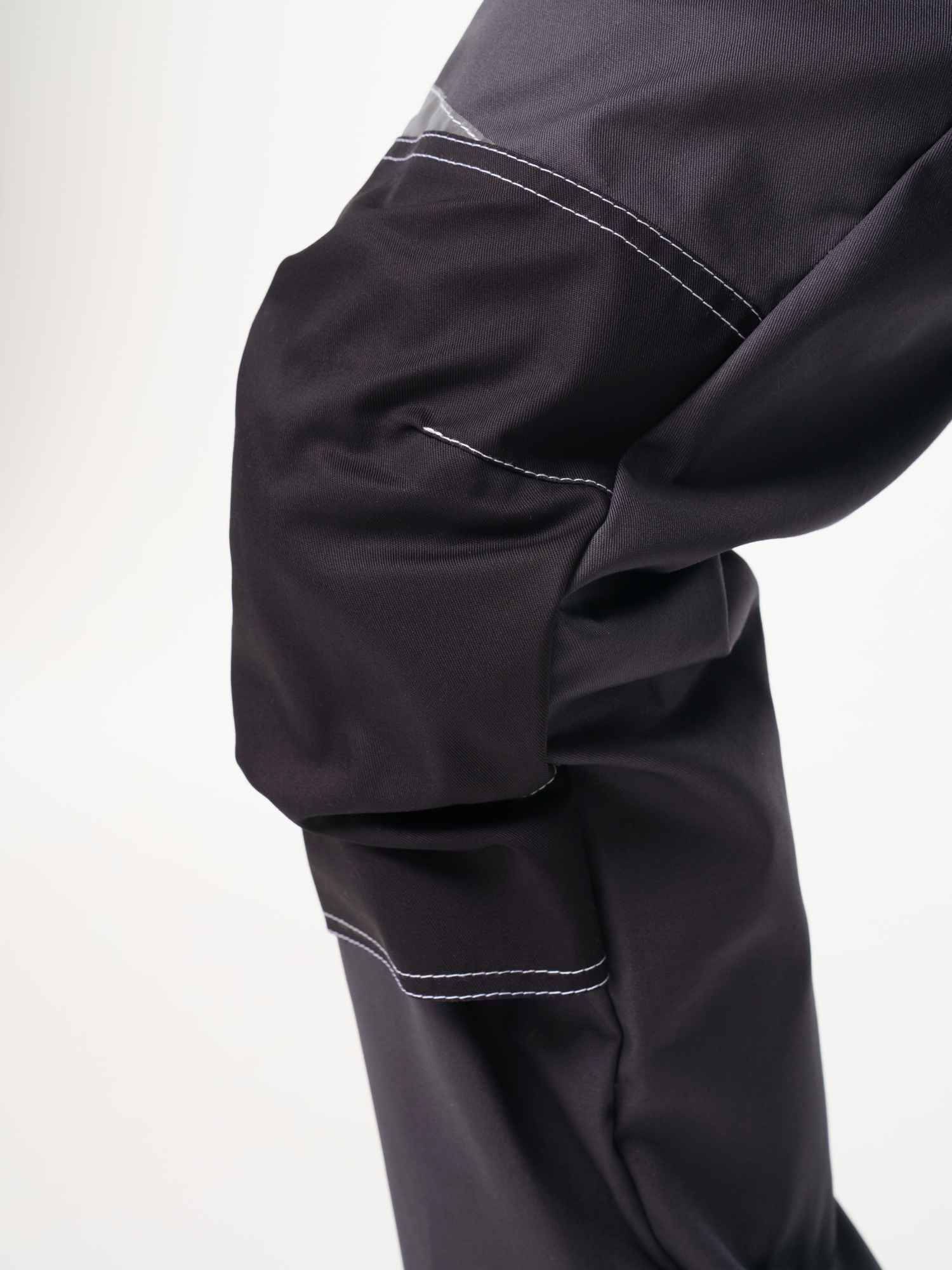 Полукомбинезон с застёжкой гульфика на молнию и застёжкой в боковом шве на пуговицы; с различными многофункциональными карманами; с объемными наколенниками; есть СОП фигурной формы .