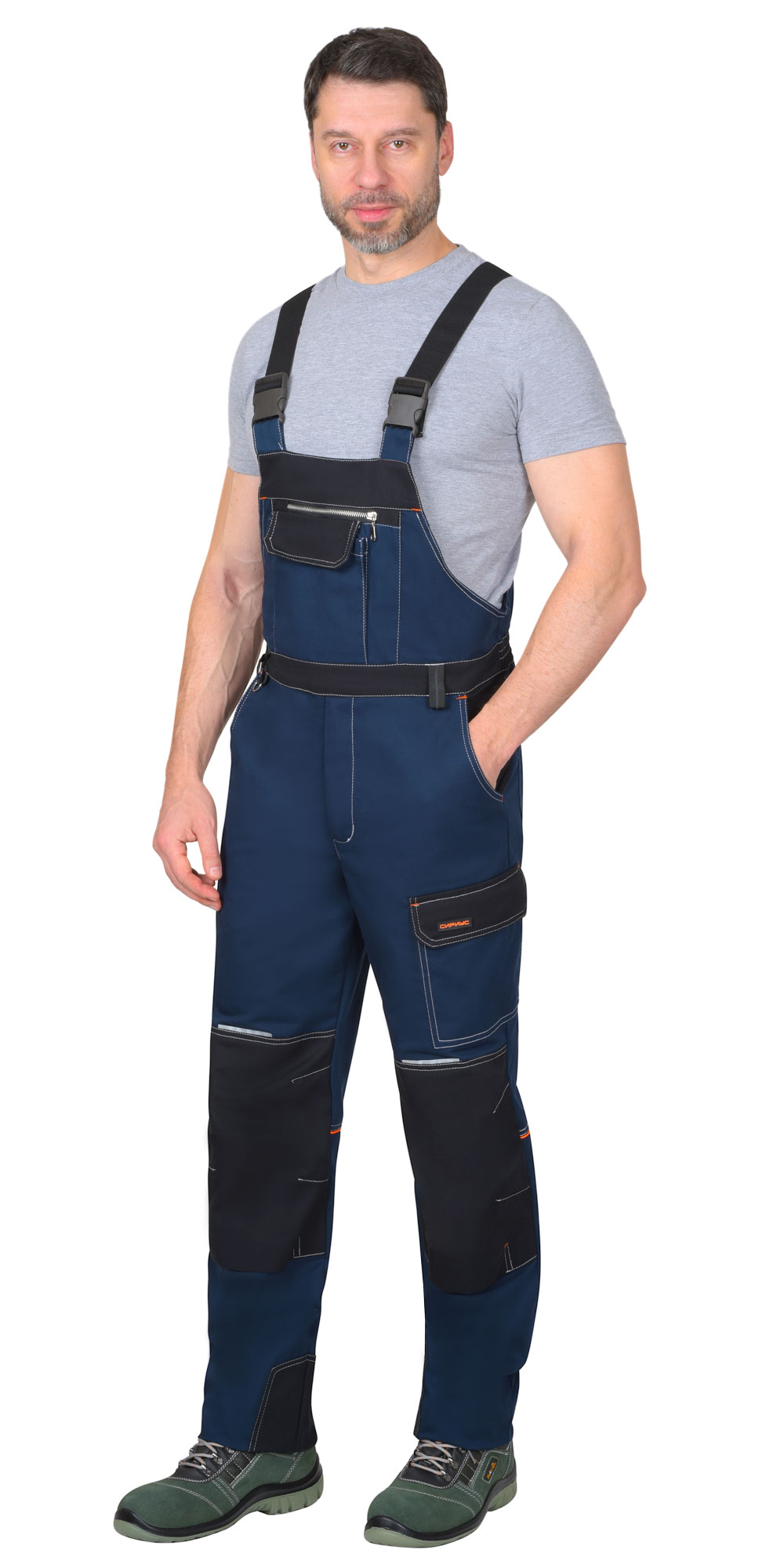 Полукомбинезон с застежками: гульфик на молнию, левая боковая на кнопки. На грудке многофункциональный комбинированный карман с клапаном на липучку. Передние половинки с боковыми внутренними карманами и объемными наколенниками. На левом боковом шве накладной полуобъемный карман с фигурным клапаном на липучку. Задние половинки с кантом контрастного цвета, кокеткой и накладными фигурными карманами. По шаговым швам брюк усиленные фигурные накладки. Пояс брюк с широкими шлевками. По шаговым швам полукомбинезона усиленные фигурные накладки. По спинке на всю ширину резинка для лучшего прилегания. Полукомбинезон с бретелями из резинки, длина регулируется застежкой-фастексом.