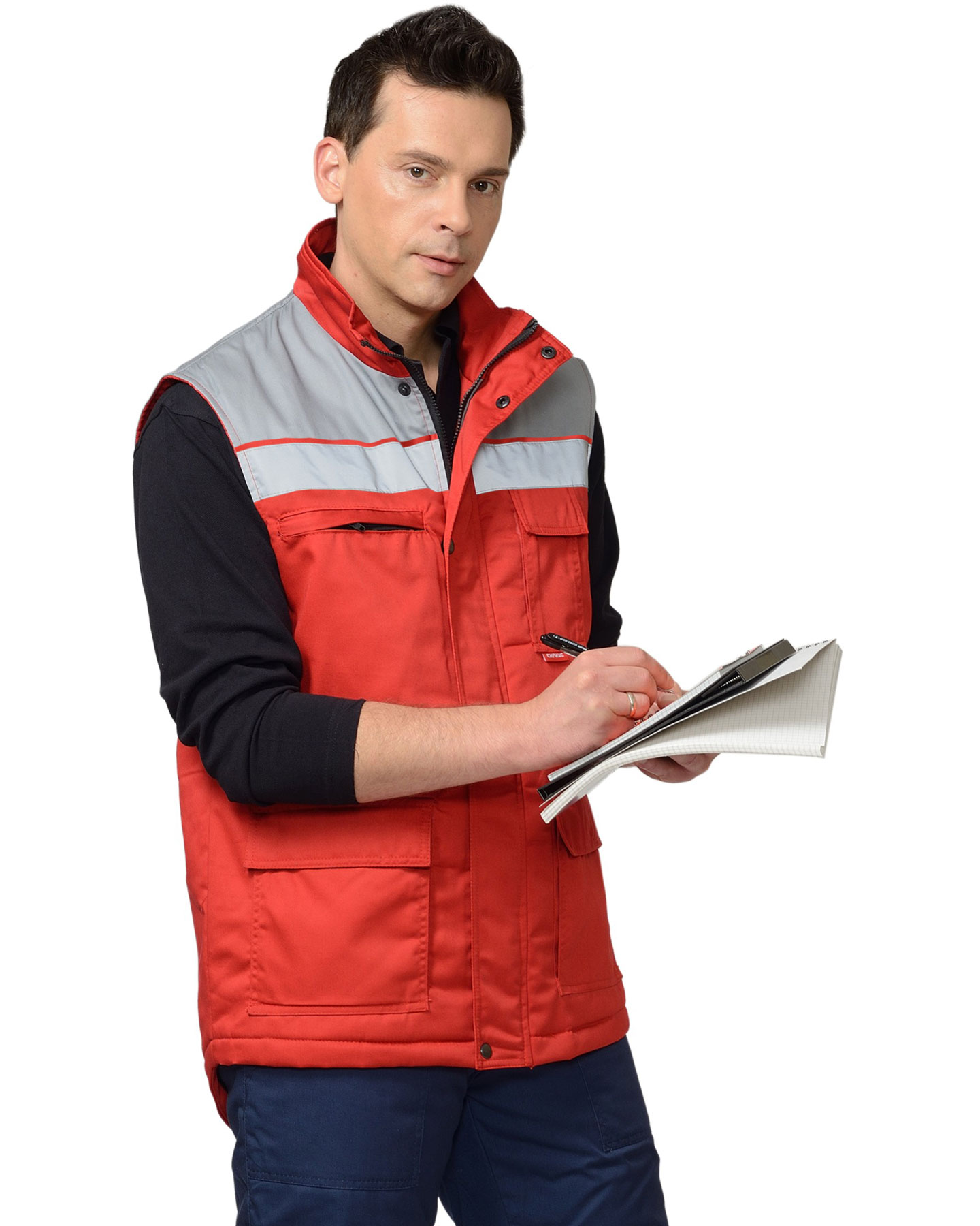 Жилет прямого силуэта; с центральной застёжкой на тесьму - «молнию» накрытую ветрозащитным клапаном, застёгивающимся на 5 кнопок; воротник - «стойка»; с кокетками полочек и спинки; с лентой светоотражающей шириной 50 мм 100% п/э настроченными по верхнему краю полочек и спинки на 5 мм ниже шва притачивания кокеток ; с различными многофункциональными карманами.