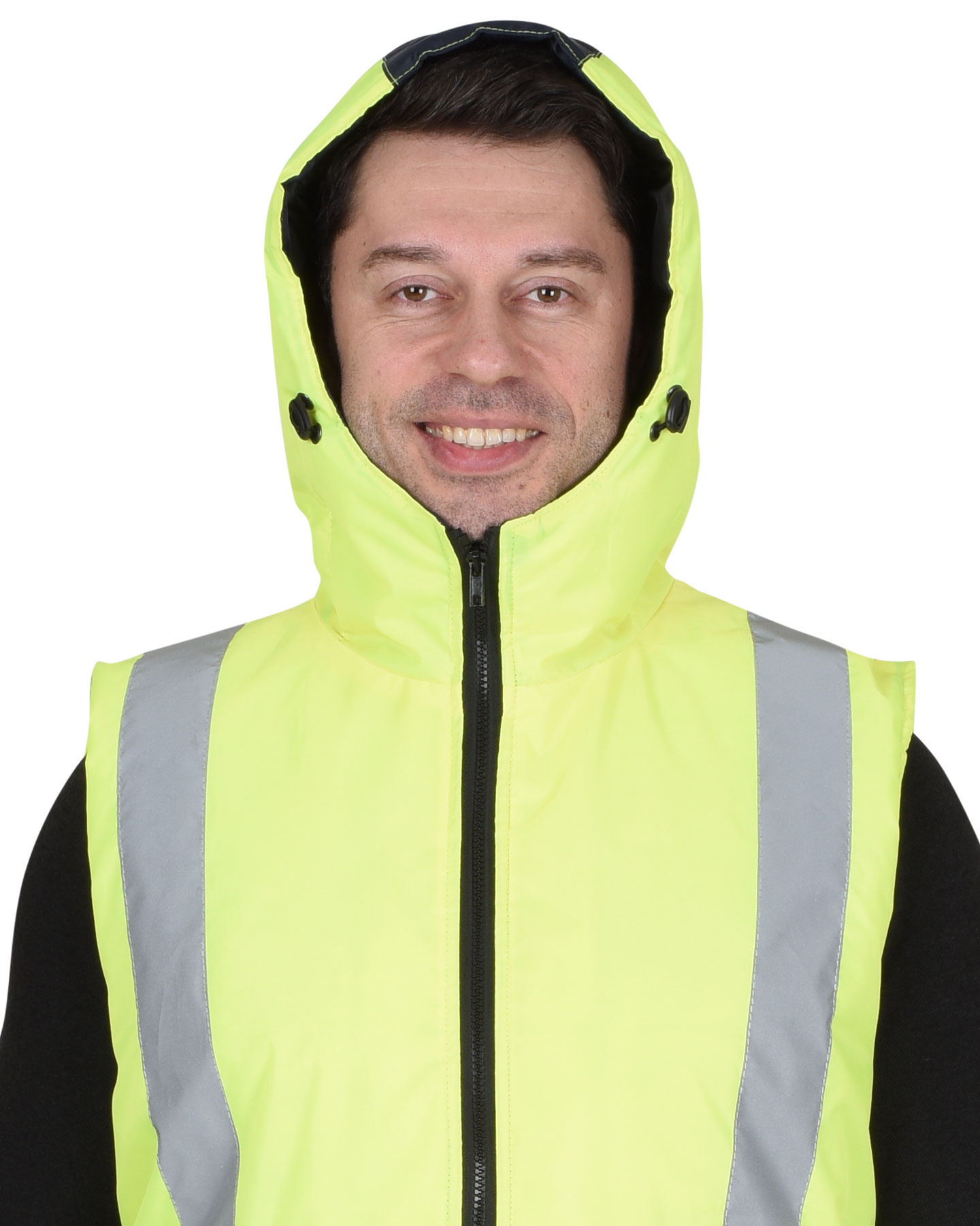 Жилет утепленный, с центральной бортовой застёжкой на тесьму - «молнию», с накладными карманами и клапанами застегивающиеся на потайную липучку 4,0см, с втачным капюшоном, с внутренним карманом застегивающийся на тесьму - «молния». В жилете предусмотрен лента светоотражающая (серая) 50мм 100% п/э для обеспечения сигнальной видимости в условиях пониженной видимости.